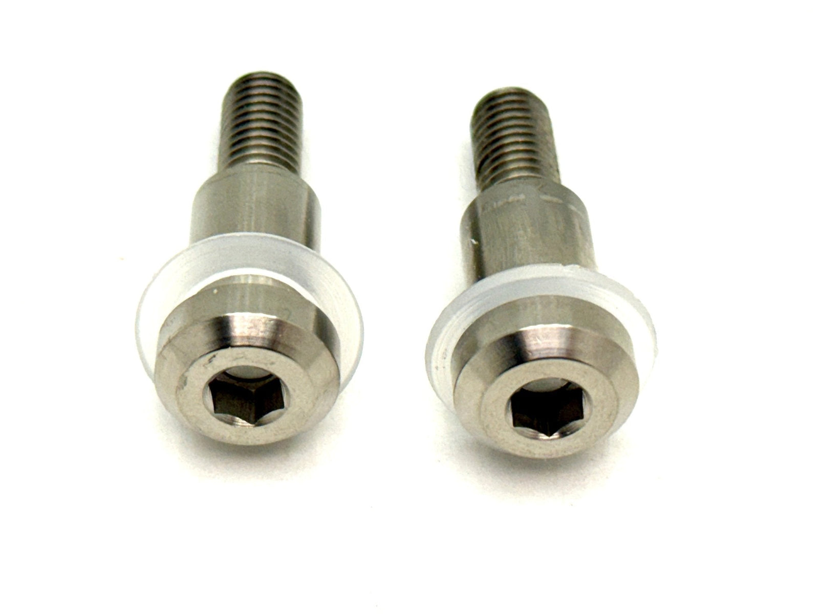 Custom titanium triangle bolts with built-in bushing sleeve for the Surron and Segway.
